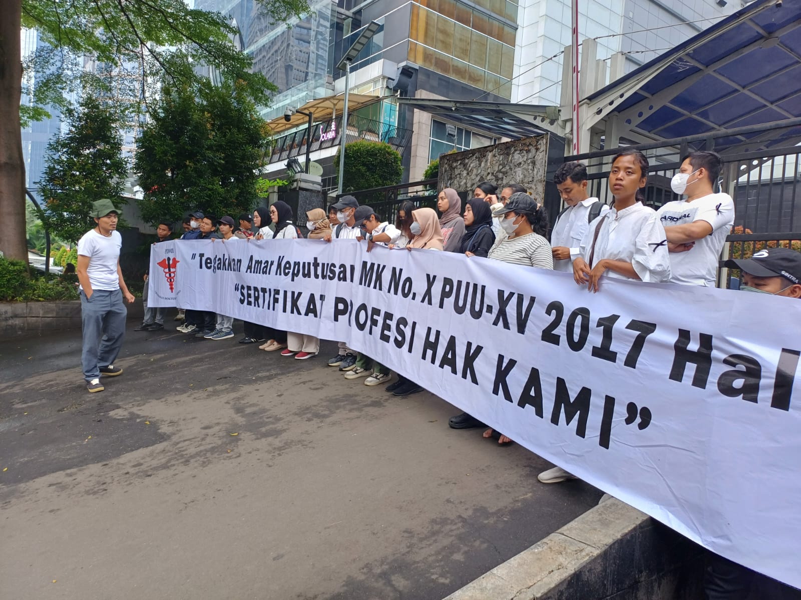 Ratusan dokter muda mewakili 3.000 dokter muda WNI dan 400 dokter muda WNA yang memprotes pemerintah akibat tidan diberi ijazah hingga bertahun-tahun dengan alasan tidak lulus Sertifikasi Kompetensi. Unjuk rasa di Kemendikti Saintek RI, Senayan, Jakarta, 18/6/2025.