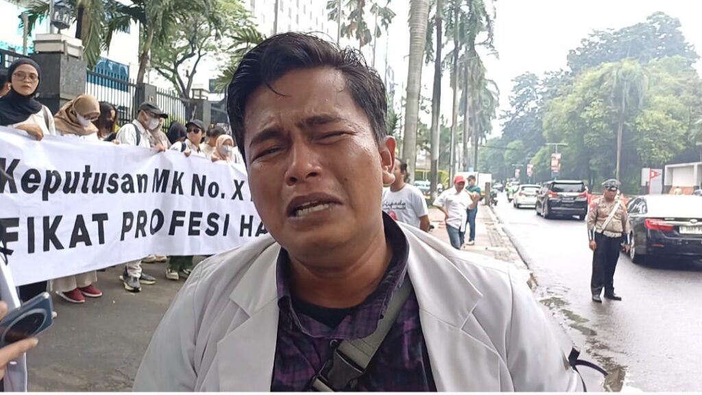 Aris, dokter muda dari Lampung, menangis saat unjuk rasa di Kemendikti Saintek RI, Senayan, Jakarta, Rabu, 18/6/2025.
