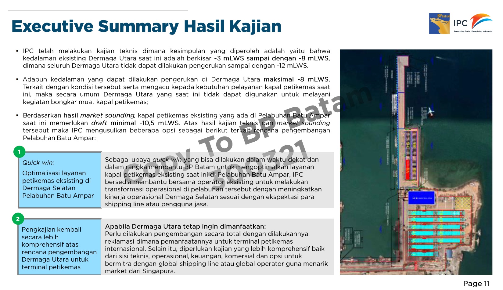 Berikut rekomendasi kajian dari PT Pelindo terhadap Dermaga Utara Terminal Pelabuhan Batuampar. IPC (Pelindo II) telah melakukan kajian teknis dimana kesimpulan yang diperoleh adalah yaitu bahwa kedalaman eksisting Dermaga Utara saat ini adalah berkisar -3mLWS sampai dengan -8mLWS, dimana seluruh Dermaga Utara tidak dapat dilakukan pengerukan sampai dengan -12 mLWS